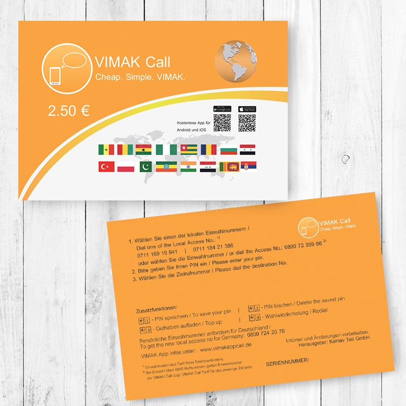 Die VIMAK App ist ein kostenfreier Service von VIMAK AppCall für Ihre Kunden. Hiermit kann man VoIP, Callthrough, SMS oder Callback mit dem Smartphone nutzen und Anrufe weltweit von dem VIMAK AppCall-Konto tätigen. Innerhalb der App kann eine Nummer aus dem Adressbuch auswählen oder manuell eingeben. Die App kann weltweit benutzt werden. Mit einer Internetverbindung telefoniert man über VoIP zu den Tarifen der VIMAK AppCall. Die App kann man auf Google Play und Apple Store herunterladen.